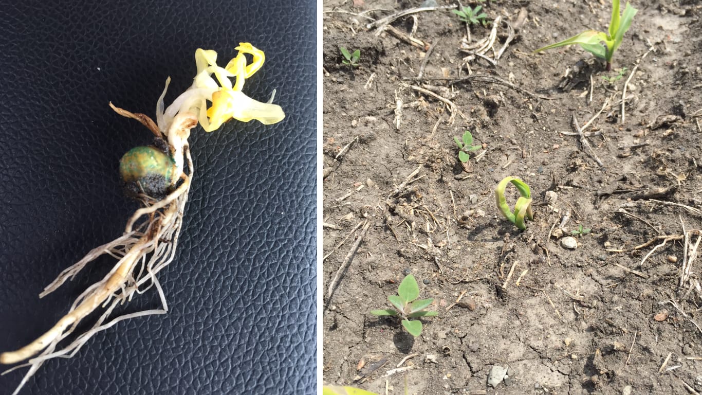 What happens underground (left) and above ground (right) when corn seed imbibes cold water, otherwise known as corkscrewing, 24-36 hours after being planted.