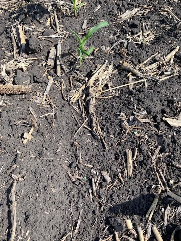You can clearly see a few kernels lying on top of the soil. And while I realize this field is corn which has more residue, that also means we need to be digging behind the planter even more often.