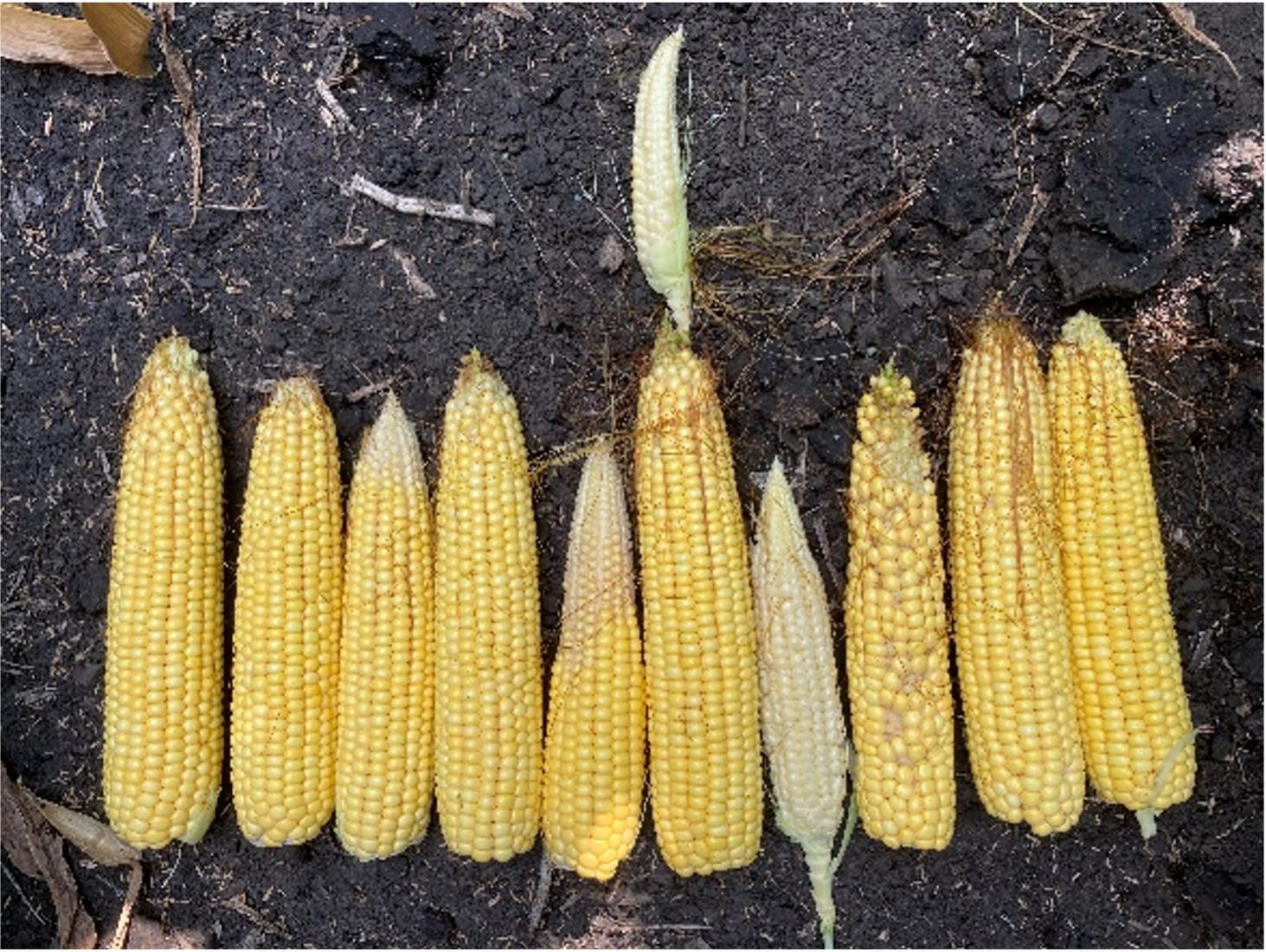 A variable stand (like the first photo) will result in cob inconsistency like this (below). Some of the cobs are starting to dent while others have just finished pollination. This is not acceptable!