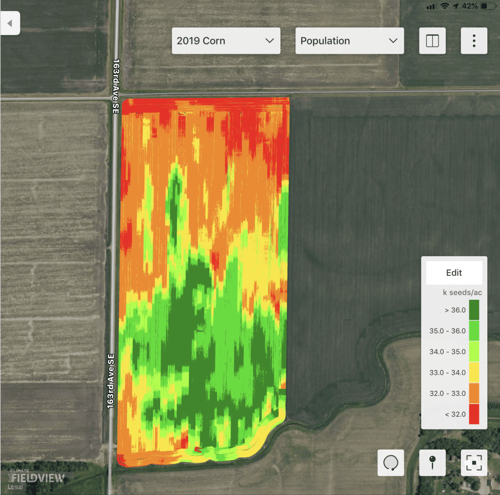 To test this technology, we flew and analyzed a field weekly. In the picture below you can see that we variable rate planted this field. We chose this field to see if the stand counting technology would pick up the change in population.