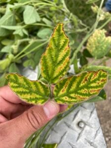 Sudden Death Syndrome can infect plants early in the season through later vegetative growth stages. Shortly after germination, the fungi infect seedling roots and will remain asymptomatic until later in the season. When plants approach late reproductive phases and seed fill, visual symptoms will appear as toxins and will move from the fungi in the roots to the leaves. August is an ideal time to start scouting for symptoms.