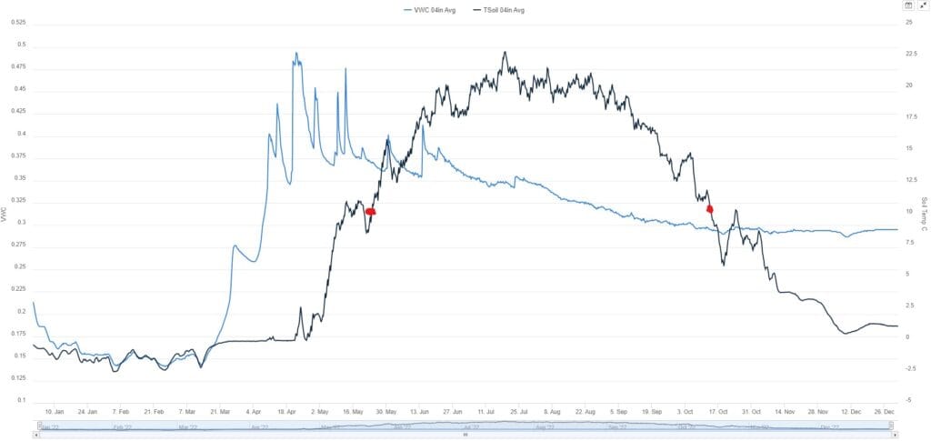 Soil moisture and temperature from Jan. 1, 2022, to Dec. 31, 2022. (https://public.eagle.io/public/dash/c3enb73ce4ehsk7)