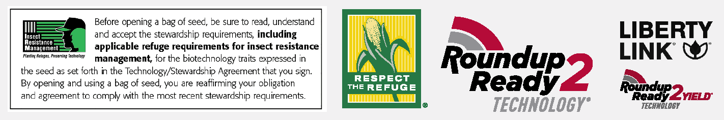 ACCIDENTAL APPLICATION OF INCOMPATIBLE HERBICIDES TO THIS VARIETY COULD RESULT IN TOTAL CROP LOSS. YOU MUST SIGN A TECHNOLOGY USE AGREEMENT AND READ THE PRODUCT USE GUIDE PRIOR TO PLANTING. The technology incorporated into this seed is protected under one or more U.S. patents which can be found at: www.traitstewardship.com.