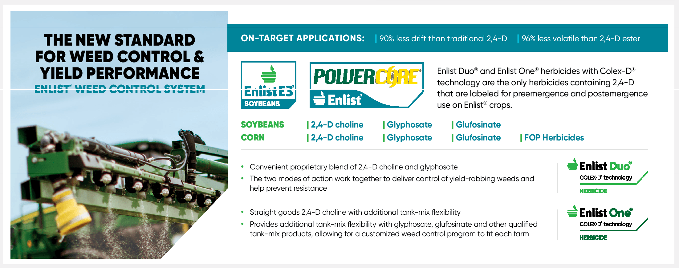 Following burndown, Enlist Duo® and Enlist One® herbicides with Colex-D® technology are the only herbicides containing 2,4-D that are authorized for preemergence and postemergence use with Enlist® crops. Consult Enlist® herbicide labels for weed species controlled. Enlist Duo and Enlist One herbicides are not registered for use or sale in all states and counties; are not registered in AK, CA, CT, HI, ID, MA, ME, MT, NH, NV, OR, RI, UT, VT, WA and WY; and have additional subcounty restrictions in AL, GA, TN and TX, while existing county restrictions still remain in FL. All users must check “Bulletins Live! Two” no earlier than six months before using Enlist One or Enlist Duo. To obtain “Bulletins,” consult epa.gov/espp/, call 1-844-447-3813, or email ESPP@epa. gov. You must use the “Bulletin” valid for the month and state and county in which Enlist One or Enlist Duo are being applied. Contact your state pesticide regulatory agency if you have questions about the registration status of Enlist® herbicides in your area. ALWAYS READ AND FOLLOW PESTICIDE LABEL DIRECTIONS. IT IS A VIOLATION OF FEDERAL AND STATE LAW TO USE ANY PESTICIDE PRODUCT OTHER THAN IN ACCORDANCE WITH ITS LABELING. ONLY USE FORMULATIONS THAT ARE SPECIFICALLY LABELED FOR SUCH USE IN THE STATE OF APPLICATION. USE OF PESTICIDE PRODUCTS, INCLUDING, WITHOUT LIMITATION, 2,4-D-CONTAINING PRODUCTS NOT AUTHORIZED FOR USE WITH ENLIST CORN AND SOYBEANS, MAY RESULT IN OFF-TARGET DAMAGE TO SENSITIVE CROPS/AREAS AND/OR SUSCEPTIBLE PLANTS, IN ADDITION TO CIVIL AND/OR CRIMINAL PENALTIES. Additional product-specific stewardship requirements for Enlist crops, including the Enlist Product Use Guide, can be found at www.traitstewardship.com.