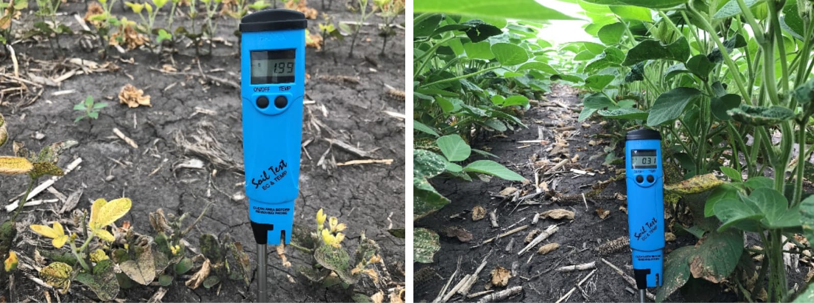 I tested many soils this past summer with much higher-than-average salt levels. A good IDC tolerant (not resistant) soybean can handle salts up to nearly 1.25 mmho/cm. I tested more than a few IDC-affected areas this summer with results ranging from 1.75 to over 4 mmho/cm. This high of a result makes it evident that the damage is a result of salts near the root zone.
