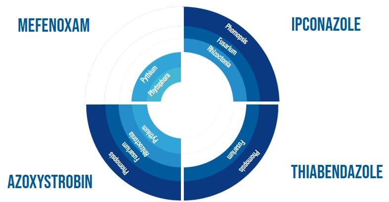 This approach improves control of pythium, phytophthora, fusarium and rhizoctonia, while supporting stronger root development and early seedling vigor. By selecting more effective molecules at lower use rates, we’re able to deliver stronger disease protection while keeping total application volume within the optimal 5–6 ounces per hundredweight. That balance preserves flexibility for inoculants or other additives when appropriate.