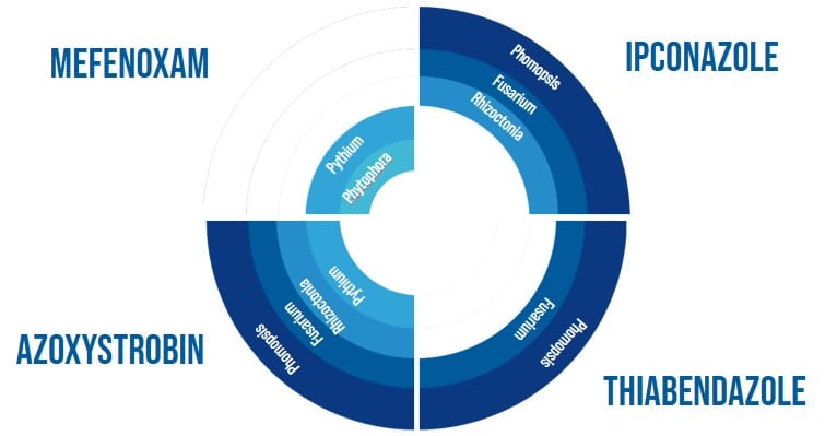This approach improves control of pythium, phytophthora, fusarium and rhizoctonia, while supporting stronger root development and early seedling vigor. By selecting more effective molecules at lower use rates, we’re able to deliver stronger disease protection while keeping total application volume within the optimal 5–6 ounces per hundredweight. That balance preserves flexibility for inoculants or other additives when appropriate.