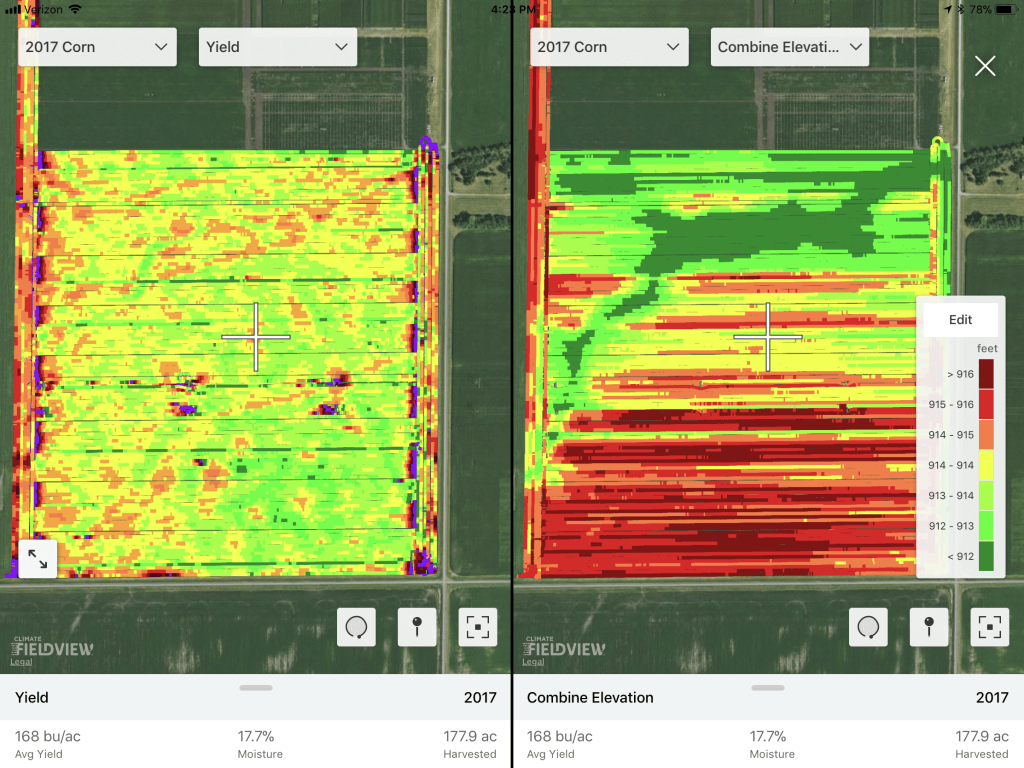 Combining an elevation and yield map from the same field can show water movement and its correlation to yield.
